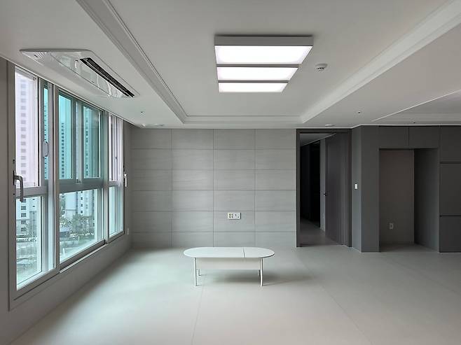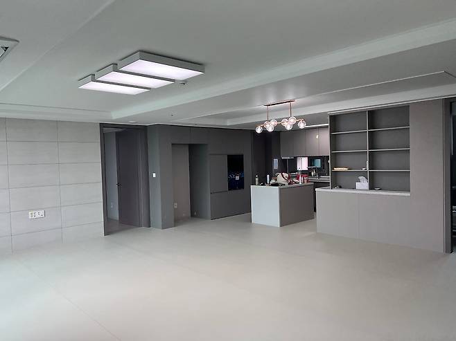 첫 입주하는 거라서 아무것도 없는 그 자체였습니다. 반려견을 위해 주 활동 범위인 거실과 주방, 현관과 복도에 매트 시공을 했어요. 베란다와 세탁실에는 탄성 시공을 했고, 줄눈 시공은 화장실, 현관, 거실 전부 다 했습니다. 그럼 매트 시공을 한 거실과 주방부터 보여드릴게요.