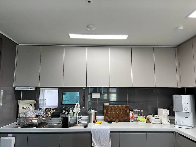 주방이 생각보다 커서 자주 쓰는 가전들은 바깥으로 꺼내어 바로 쓸 수 있게 해놨고, 나머지 그릇이나 프라이팬과 잡다한 주방용품들은 상부장과 하부장을 이용해 감췄습니다.