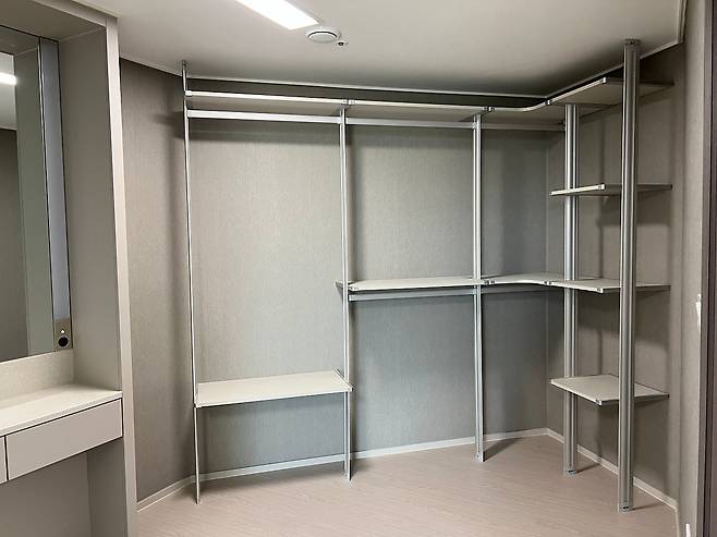 드레스룸 행거 자체가 제 옷을 다 보관하기에 부족함이 있었고, 오빠 옷까지 보관하기에 난감해서 살까 하던 찰나에 새로 생긴 수납장이 있어 수월해졌어요. 속옷이나 양말, 안 입는 옷들은 수납장에 보관했고 얼마 없는 오빠 옷도 수납장에 보관했어요.