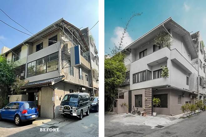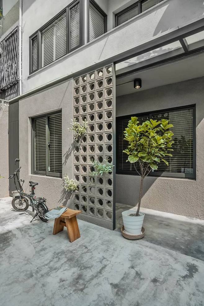 도로 쪽에서 보면 집이 살짝 뒤로 물러나 있다. 그 덕분에 자연스럽게 앞마당이 만들어지고, 그 안에 차량과 오토바이가 함께 들어간다. 외부 현관과 내부 현관이 이어지는 구조라 집에 들어오는 과정이 한 번에 끝나지 않는다. 천천히 안으로 들어오게 만든다.