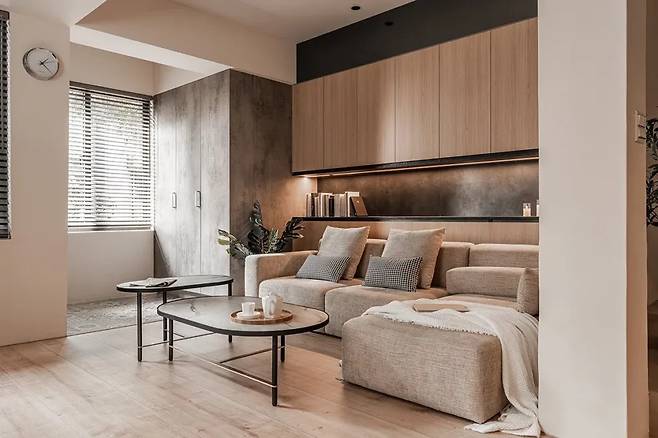 TV 벽을 없애고 브래킷으로 처리한 선택이 공간을 훨씬 가볍게 만든다. 대신 창이 중심이 된다. 시간에 따라 바뀌는 빛의 방향이 거실 분위기를 계속 바꾼다. 수납은 바닥에 낮게 깔아 공간의 폭을 넓혀 보이게 하고, 생활감은 자연스럽게 숨긴다.