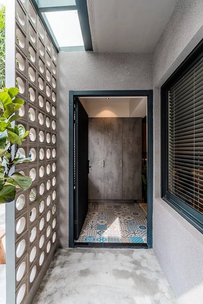 머리 위로는 천창이 열려 있어 시간에 따라 빛이 떨어지고, 바닥과 벽에 그림자가 겹치며 입구 공간을 하나의 장면처럼 만든다. 격자 벽돌과 무늬 유리는 시선을 적당히 걸러내면서도 완전히 막지는 않는다. 오래된 사과꽃 무늬 유리가 자연스럽게 섞이며, 새 집인데도 어딘가 익숙한 분위기가 남는다.