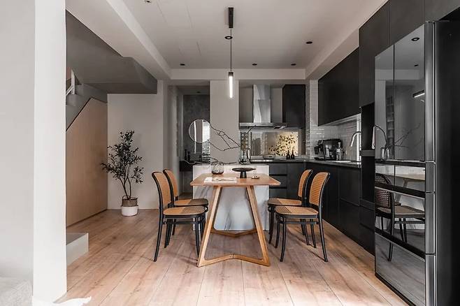 주방 바로 옆에 이어진 다이닝룸은 별도로 나뉘지 않는다. 대신 시야가 트인 상태에서 자연스럽게 이어진다. 이 집에서는 식사 공간도 하나의 흐름 안에 들어간다. 앉아 있으면 거실 쪽 빛과 주방 쪽 움직임이 동시에 느껴진다. 가족이 서로 다른 일을 하면서도 같은 공간에 있는 느낌을 유지하게 만든다.