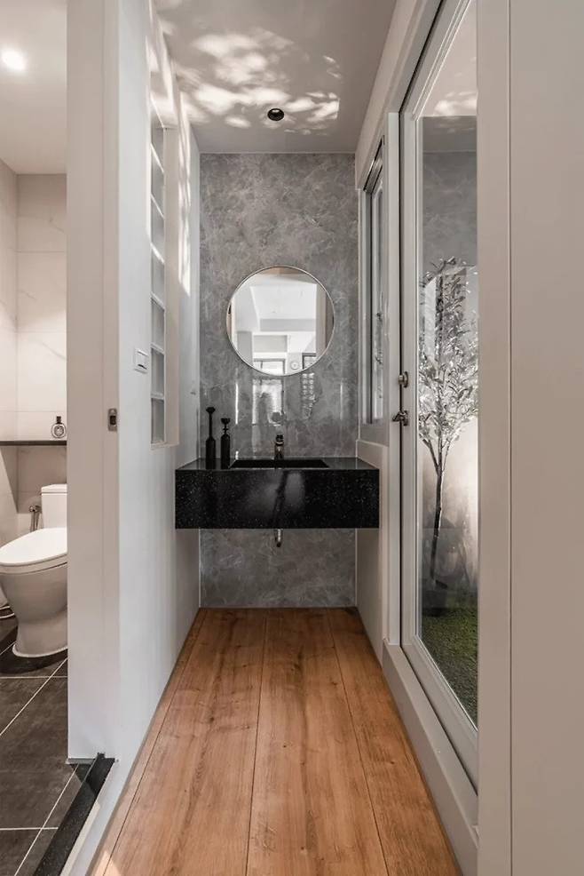 집 뒤쪽으로 이동하면 분위기가 또 달라진다. 욕실이 뒷마당과 직접 연결되면서 실내와 실외의 경계가 거의 사라진다. 외부 세면대가 따로 있어 손을 씻는 동선이 자연스럽게 이어지고, 반옥외 형태의 발코니는 바람이 통하면서도 비를 피할 수 있다.