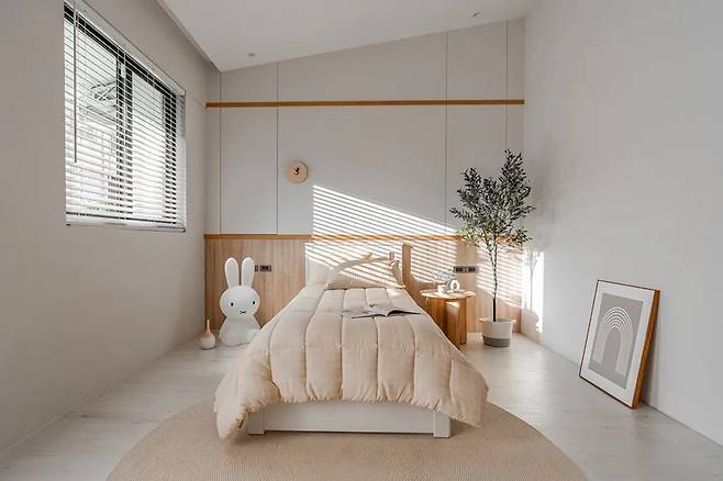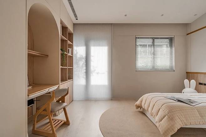 3층에 위치한 딸 방은 집 안에서 가장 분위기가 다른 공간이다. 경사진 천장을 그대로 살려 다락 같은 느낌을 만들고, 그 아래를 크림 톤으로 채워 부드럽게 정리했다. 나무 결이 은은하게 드러나는 가구와 아치형 디테일이 공간을 감싸듯 이어진다.