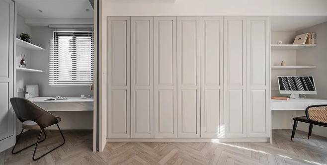 침실 양쪽으로 나뉜 드레스룸은 슬라이딩 도어로 구분된다. 같은 공간 안에 있지만 시간대가 다른 생활을 고려해 분리와 연결을 동시에 잡은 구조다. 유리 도어를 닫아도 빛은 그대로 통과해 공간이 막히지 않는다. 벽면을 따라 이어지는 패널 마감이 시각적으로 길게 연결되면서 집 전체 디자인과도 자연스럽게 이어진다.