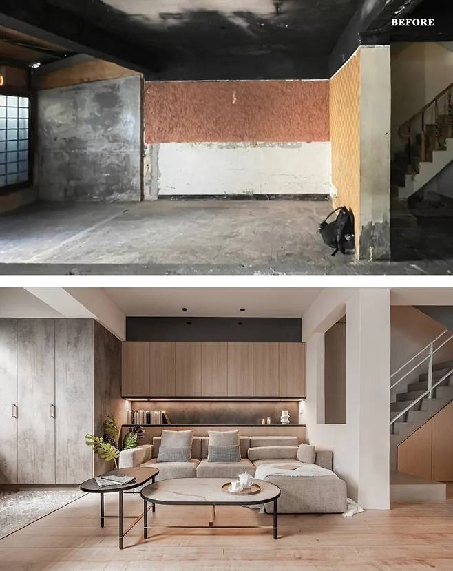 거실은 들어오자마자 확 트이는 대신, 보와 기둥이 만들어내는 구획 안에서 천천히 펼쳐진다. 공간을 나누는 구조물이지만 오히려 시선을 이끄는 요소로 작동한다. 나무 톤이 중심을 잡고, 바닥과 벽의 질감이 이어지면서 집 전체의 온도를 맞춘다.
