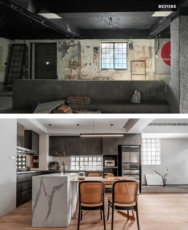 거실과 이어지는 주방은 경계가 거의 느껴지지 않는다. 벽을 최소한으로 줄이고 조리대와 아일랜드만으로 영역을 구분했다. L자형 조리대와 아일랜드가 맞물리며 자연스럽게 U자형 동선이 만들어진다. 움직임이 끊기지 않고 이어진다.