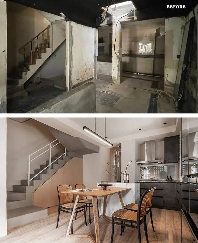 주방에 서 있으면 거실과 다이닝룸, 그리고 뒤쪽 공간까지 한눈에 들어온다. 가족이 어디에 있는지 굳이 확인하지 않아도 보이는 구조다. 계단 아래 남던 공간은 수납으로 채워 넣어 동선은 넓히고 기능은 놓치지 않았다.