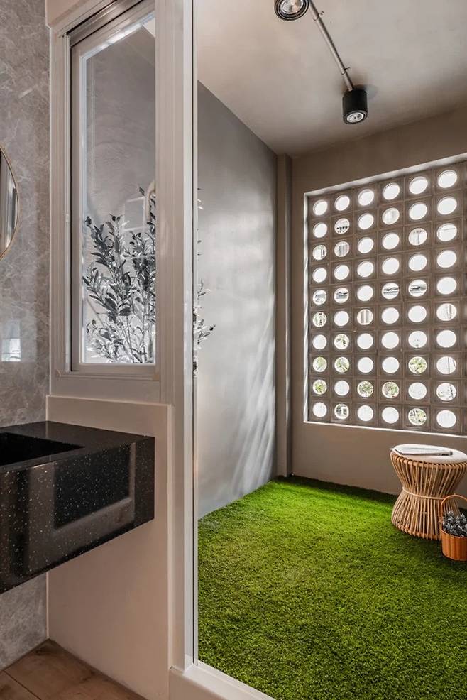 발코니는 실내처럼 사용할 수 있도록 인조 잔디를 깔아 맨발로 나갈 수 있게 만들었다. 창을 통해 들어오는 빛과 그림자가 하루 종일 변하면서 방의 분위기를 계속 바꿔준다.