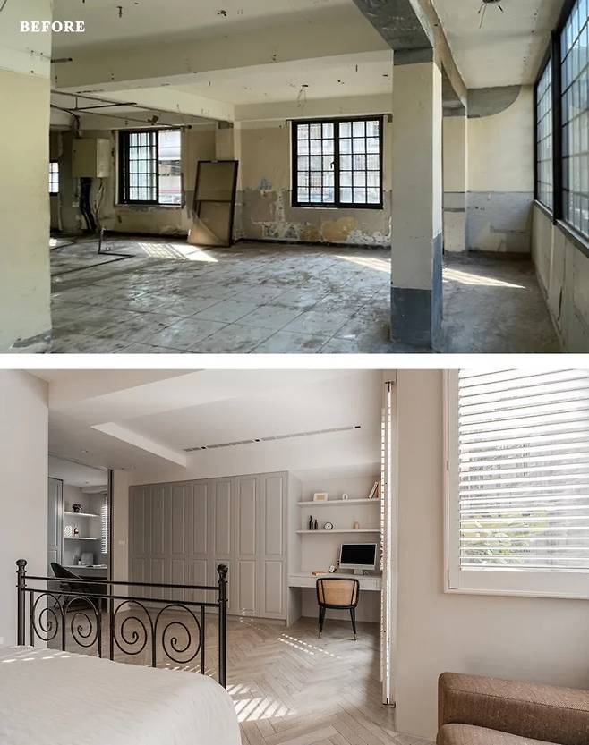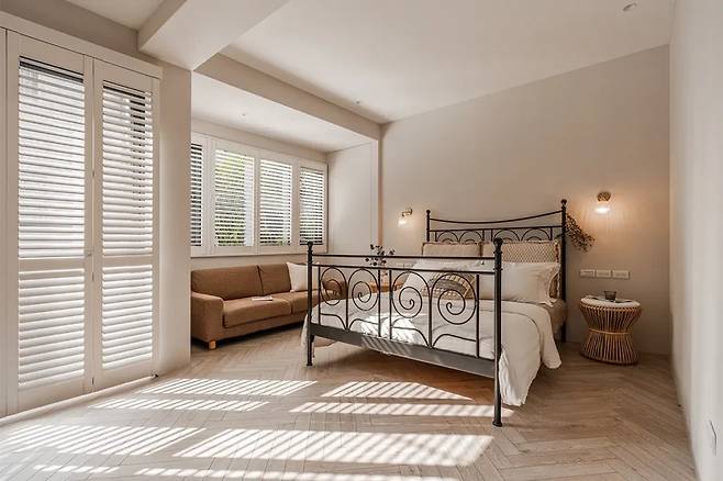 창밖 풍경까지 자연스럽게 실내로 끌어들여, 방 안에서도 바깥의 변화가 느껴진다. 소파를 둔 작은 휴식 공간이 따로 마련되어 있어 단순한 침실 이상의 역할을 한다.