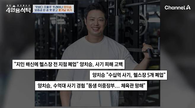 갑작스러운 폐업 소식에 많은 이들의 궁금증이 이어진 가운데, 양치승은 앞서 채널A '4인용 식탁' 방송에서 겪고 있는 헬스장 관련 사기 피해를 고백한 사실이 재조명됐습니다.