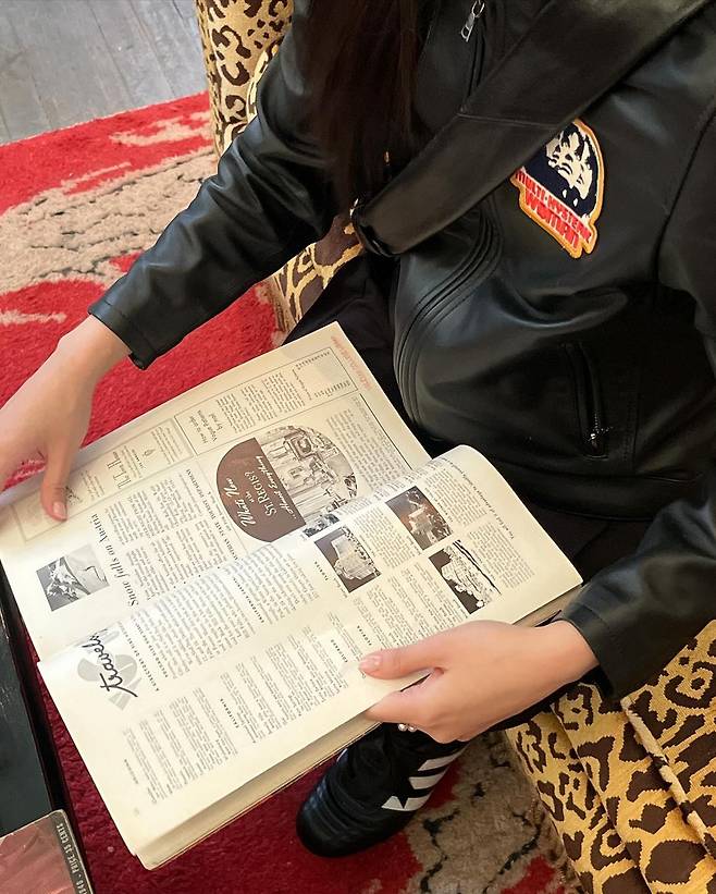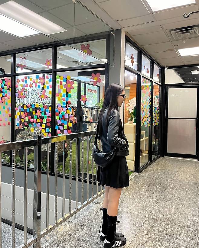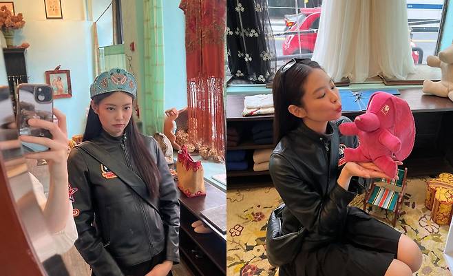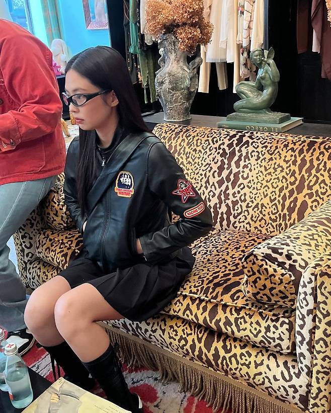 사진 속 제니는 블랙 가죽 자켓과 블랙 플리츠 스커트를 입고 블랙 롱삭스와 스니커즈를 신어 올블랙룩으로 여행을 즐겼다.