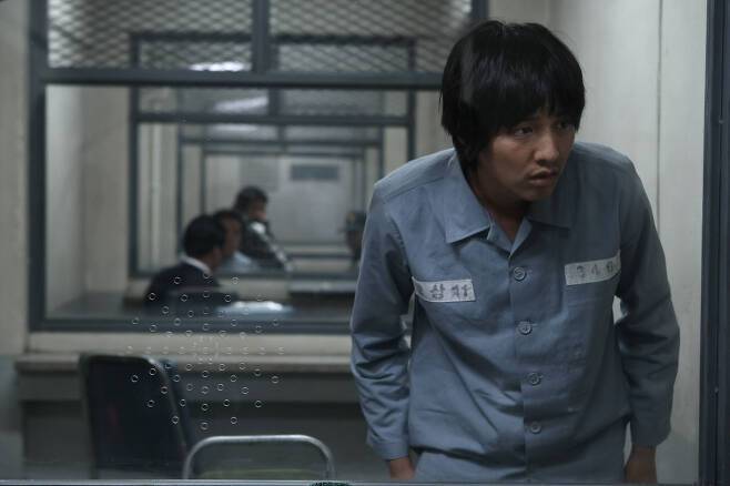 -도준을 만나는 구치소 접견실이 엘레비이터 양쪽 거울을 보는 듯한 느낌으로 만들어졌다. 사실 이 접견실은 옆방 접견실과 다른 면회객들이 보이도록 설계되었다.