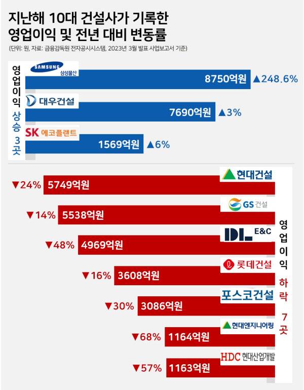 [땅집고]지난해 국내 10대 건설사 중 7곳의 영업이익이 전년 대비 최대 70% 가까이 쪼그라든 것으로 나타났다. 부동산 경기 침체와 고금리 여파로 새아파트 분양 성적이 ‘참패’ 수준을 기록한데다, 자재값 인상과 인건비 상승 등 외부적 악재들이 겹쳤기 때문으로 분석된다.