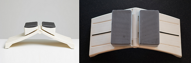 슬라힙은 틀어진 골반 교정에 특화된 특허 받은 운동 기구다. 기구는 정면에서 봐도, 위에서 봐도 ‘시옷(ㅅ)’ 모양이다. 허벅지 안쪽과 엉덩이 근육이 시옷처럼 대각선으로 떨어지는 형태이기 때문이다. 꼭대기에는 발이나 무릎을 올려둘 수 있는 패드가 한 쌍 있다.