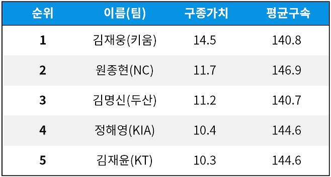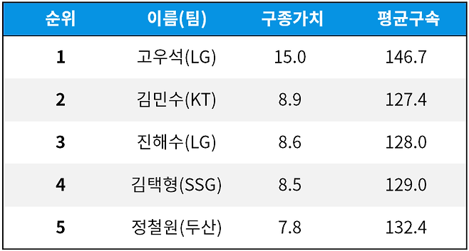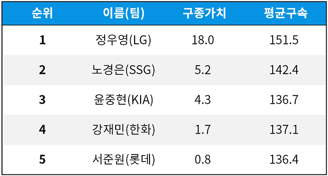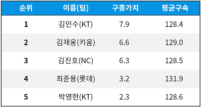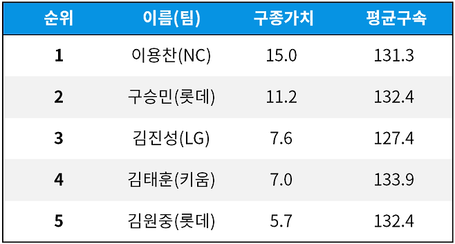2022시즌 불펜 투수(30이닝 이상 투구) 구종 가치 TOP 5를 알아봤습니다.