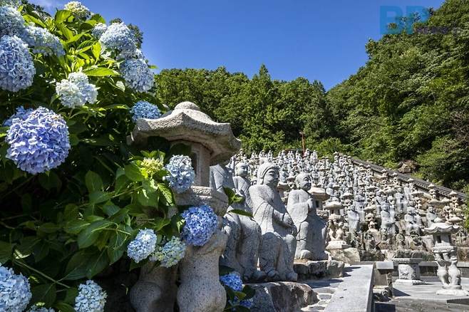 오백나한상 주변에는 푸른 수국이 피어나 이 거대한 석조 조각상들을 장식한다. 불교 미술과 어우러진 수국을 감상하고 싶다면, 삼밀사를 방문해 보자.