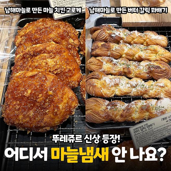 남해마늘로 만든 마늘 치킨 고로케와 남해마늘로 만든 버터 갈릭 꽈배기가 뚜레쥬르의 신상이랍니다!! 사진만 봐도 너무 맛있어 보이지 않나요?후후 벌써부터 침 고이잖아~