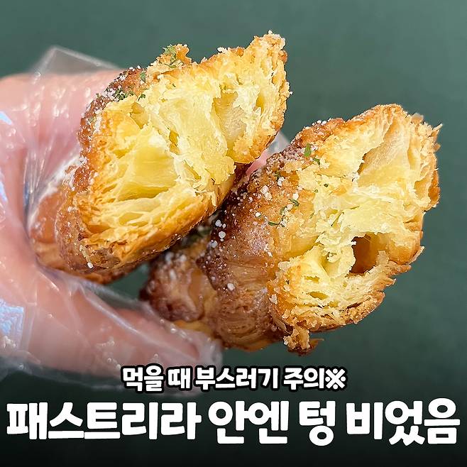패스트리라 결이 살아있답니다~ 하지만, 먹을 때 부스러기가 계속 후루룩 떨어지니 집안에서 먹을 땐 먹고 부스러기 깨끗하게 치워주셔야 해용★