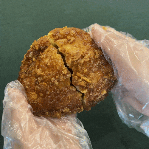 처음 딱 봤을 때 고로케보다 치킨 패티처럼 생겼더라고요ㅋㅋㅋ 고로케마다 달랐지만, 밥심이 고른 고로케의 옆면은 두툼했답니다!