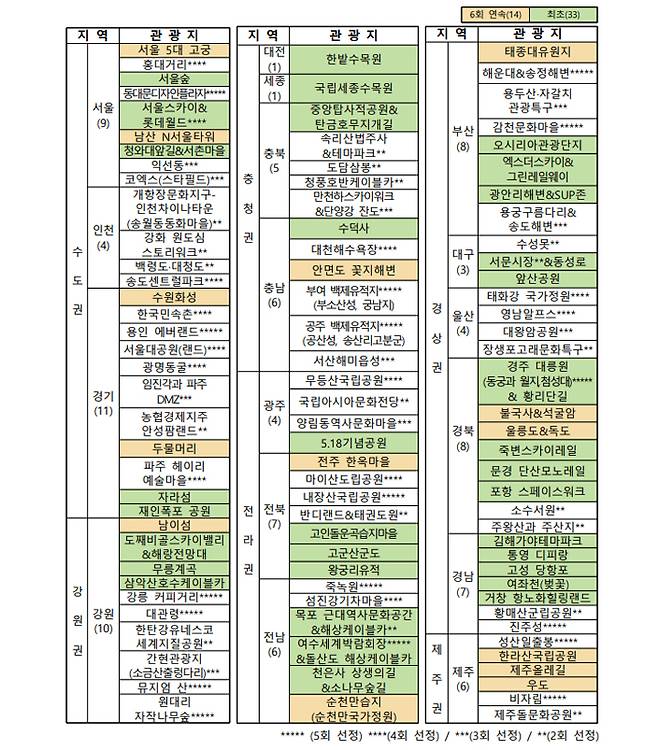 ▶서울 5대 고궁, 제주올레길, 전주 한옥마을, 경주 불국사․석굴암 등 오래, 자주 볼수록 아름다운 14개소 6회 연속 선정