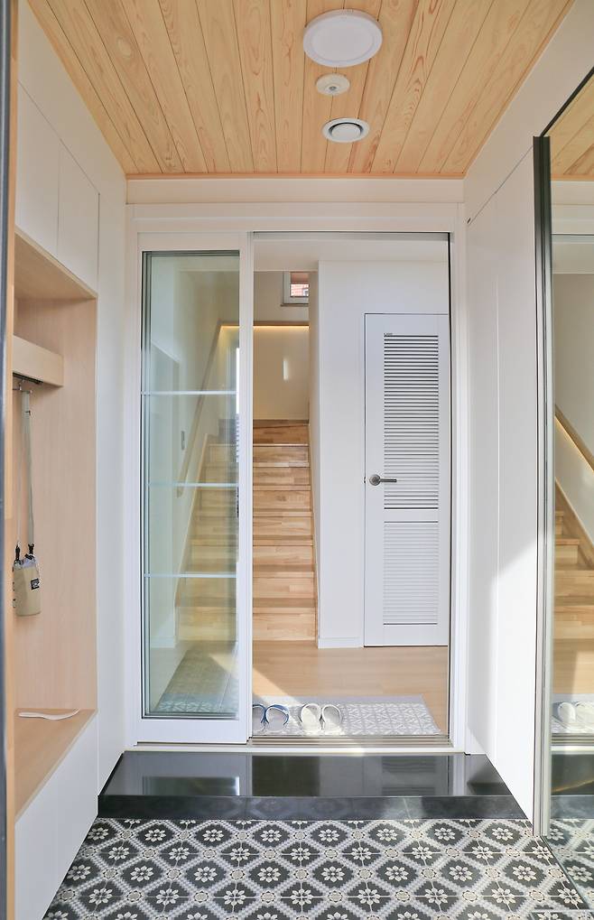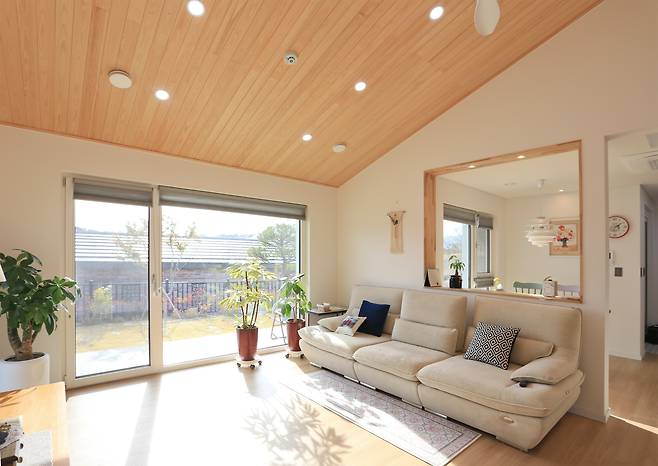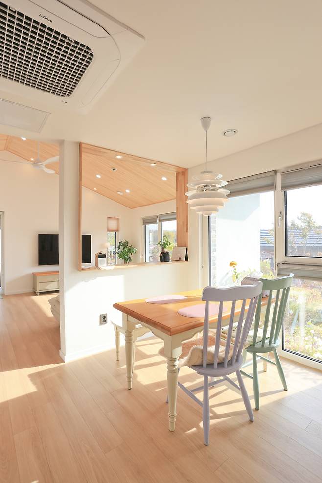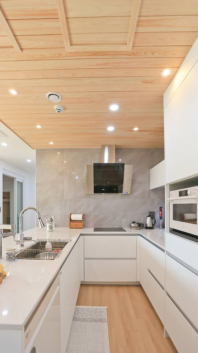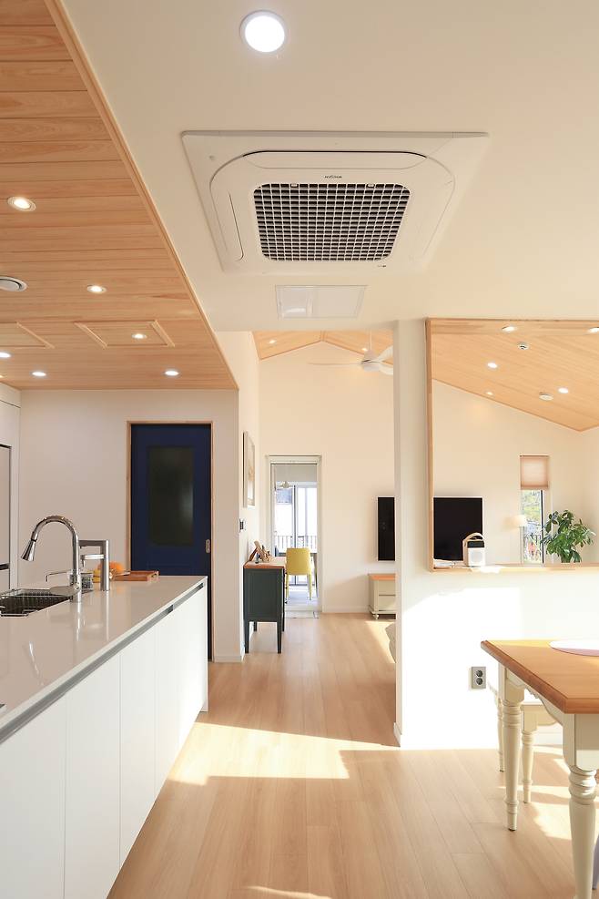 당초 건축주 부부가 공통으로 모은 의견은 내부를 편백나무로 마감하는 것이었다. 그러나 구조를 고려해 현관, 거실, 주방, 안방, 선룸 천장에만 적용하기로 타협했다. 실제로 편백나무로 마감한 덕분에 새집증후군은 거의 느끼지 못했다고 한다. 또한 편백나무와 더불어 쾌적한 실내 환경을 이루는데 한 몫한 것은 바로 열회수환기장치다. 열회수환기장치는 실내의 오염 공기를 배출시키고 외부의 신선한 공기를 공급하는 양방향 열회수 환기시스템으로써 패시브하우스를 구성하는 필수 요소다. 이 덕을 톡톡히 본 사람은 건축주였다.