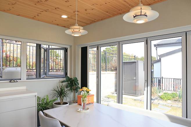 “당초 선룸은 전체를 유리로 마감해 온실처럼 할까도 했는데, 전체 형태와 이질감을 최소화하고자 지붕과 기둥을 집에 맞춰 통일감을 주는 방향으로 의견을 모았어요. 지금은 접대공간, 티타임공간, 취미공간과 같이 다용도로 역할을 맡고 있습니다.”