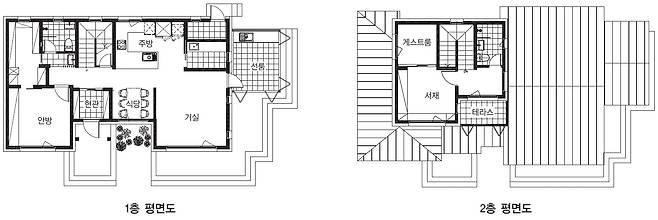 2층 서재 또한 건축주 부부가 신경 쓴 곳 중 하나다. 다리를 쭉 펴도 넉넉할 정도로 공간을 마련했고, 대관령 능선이 보이는 풍광을 고스란히 담고자 통창을 계획했다. 이렇게 평면은 1층은 생활, 2층은 휴게 공간으로 크게 나누고, 자연과 함께하는 전원생활의 장점을 한껏 담아냈다.