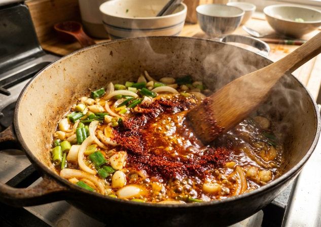 냄비에 식용유를 두르고 대파와 양파를 먼저 볶아 파기름을 냅니다.여기에 다진 마늘, 고춧가루를 넣어 30초 정도 볶으면 얼큰한 고추기름이 만들어집니다. 이 과정이 국물 맛의 핵심입니다.
