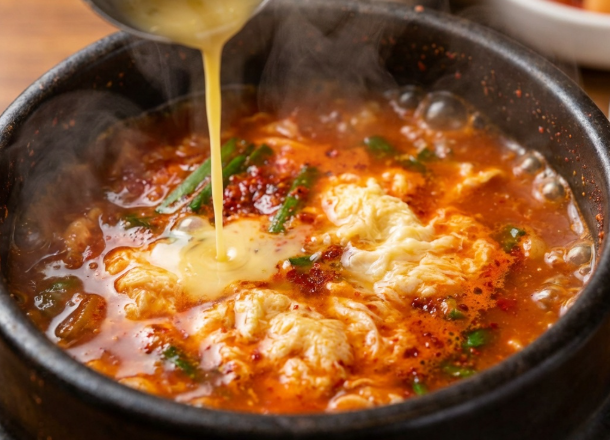 국물이 팔팔 끓을 때 풀어둔 계란을 원을 그리듯 천천히 붓습니다.5초 정도 그대로 두었다가 살살 저으면 몽글몽글 예쁜 계란꽃이 생깁니다.마지막으로 후추 톡, 간 맞추면 완성입니다.