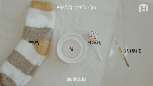 수면양말과 컵, 막대사탕, 포장봉투와 끈이 필요합니다.
