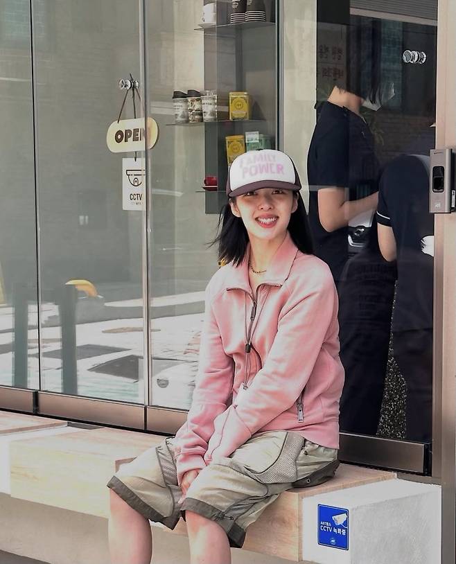 핑크 집업 재킷과 그레이톤 카고 반바지를 매치해 캐주얼하고 스포티한 분위기를 선보였습니다.