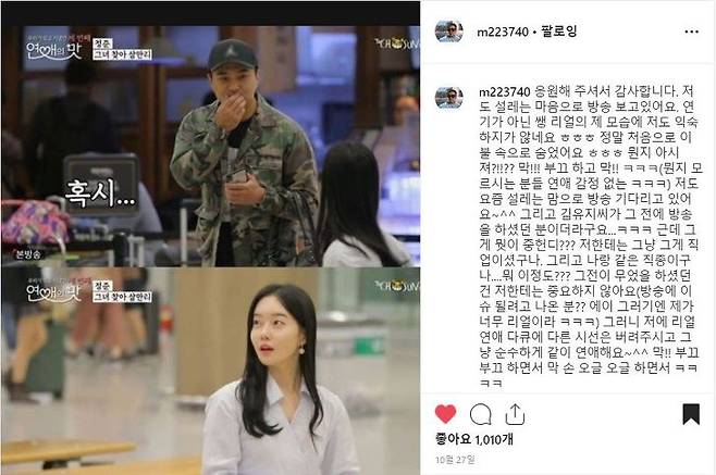 '연애의 맛3' 첫 방송이 나간지 사흘 후인 10월 27일 자신의 인스타그램에 김유지와의 첫 만남 장면과 장문의 글을 올렸는습니다. 정준은 글에서 "응원해 주셔서 감사합니다. 저도 설레는 마음으로 방송 보고있어요. 연기가 아닌 쌩 리얼의 제 모습에 저도 익숙하지가 않네요. 정말 처음으로 이불 속으로 숨었어요."라고 김유지와의 설렘임을 숨기지 않았습니다.