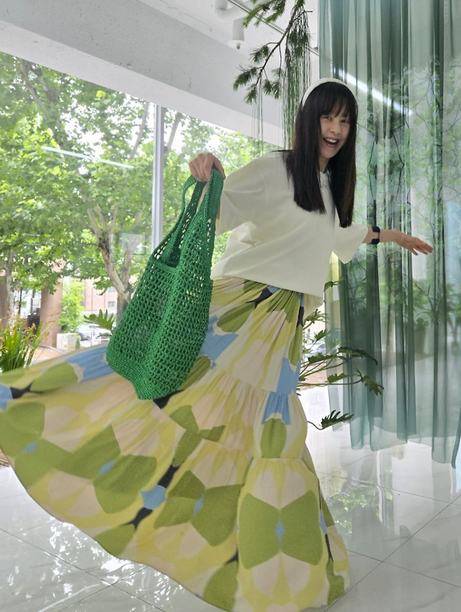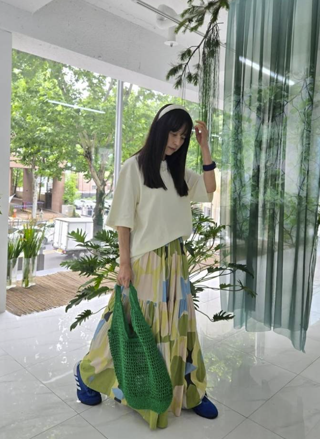 사진 속 서정희님은 여유로운 실루엣의 아이보리 톤 반팔 니트와 그린, 블루, 라이트 옐로 등 다양한 컬러의 플로럴 패턴이 돋보이는 플레어 실루엣의 롱 스커트를 매치했습니다. 이 데일리룩은 빈티지하면서도 생기 넘치는 여름 스타일을 완성했어요. 🌿👗
