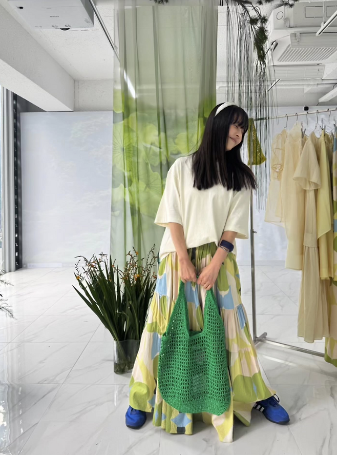 또한, 선명한 컬러감의 그린 네트백, 블루 컬러 운동화, 화이트 헤어 밴드를 매치해 편안함과 활동성을 동시에 갖춘 여름 스타일링을 선보였습니다.