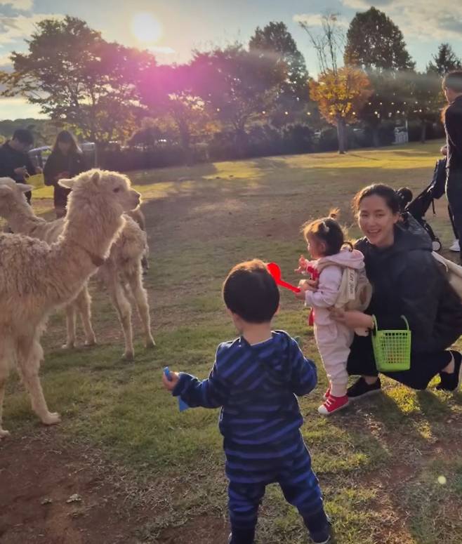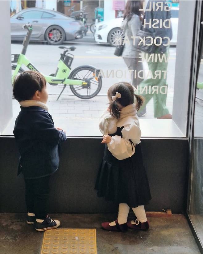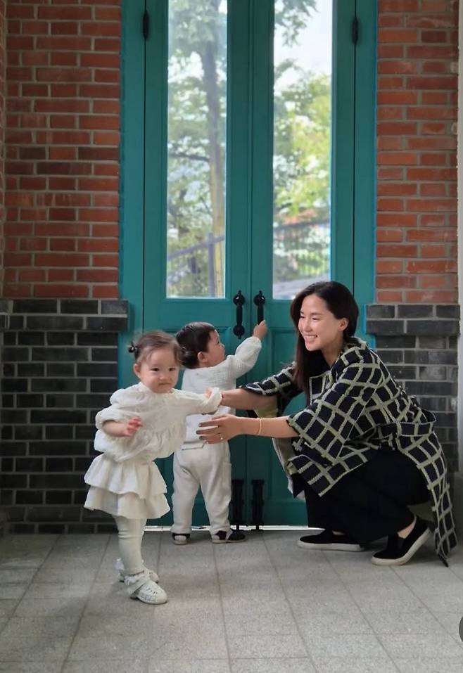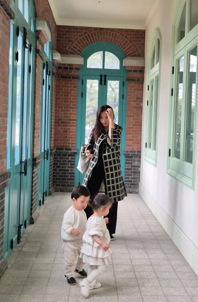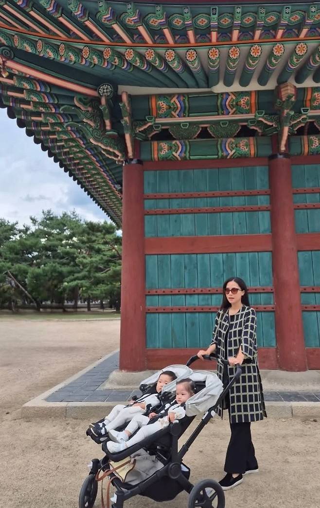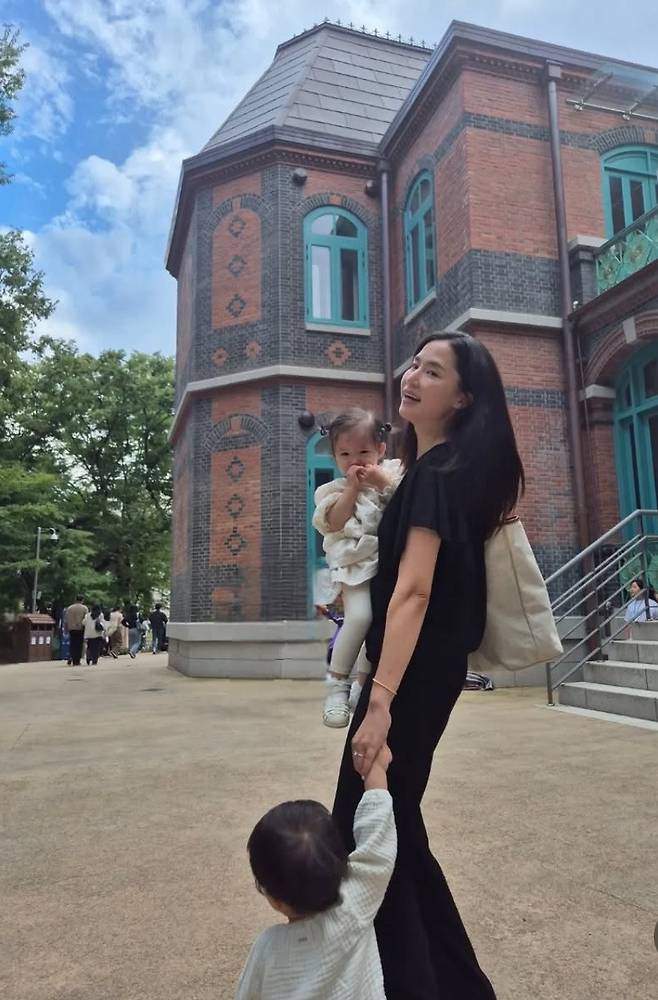 블랙 톤의 심플한 팬츠 셋업으로 편안하면서도 날씬한 실루엣을 살렸으며, 실용적인 에코백과 함께 육아 중에도 감각적인 데일리룩을 완성했습니다.