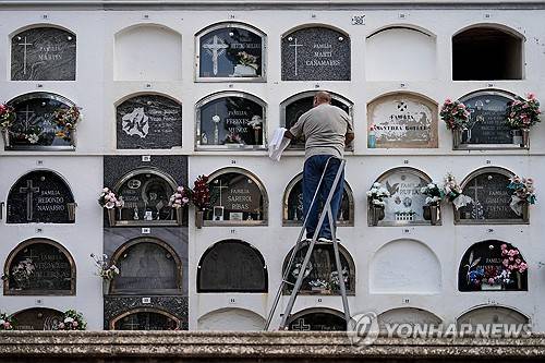 epa11695723 A man visits the grave of a loved one at a cemetery in Barcelona, Spain, 01 November 2024. Catholics in Spain traditionally visit cemeteries to remember departed loved ones on 01 November in observance of All Saints' Day. EPA/ENRIC FONTCUBERTA