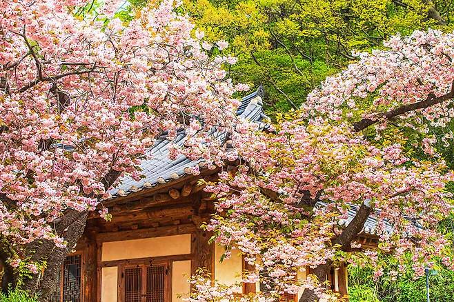 고즈넉한 사찰과 분홍빛 벚꽃이 어우러진 풍경은 사진 속이 아닌 현실에서 마주하는 그림 같다. 대웅전 앞마당에 서서 주변을 둘러보면, 꽃잎이 흩날리는 고요한 풍경에 절로 마음이 차분해진다.
