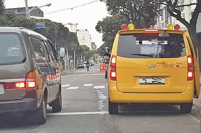 후행 차량 외에도 편도 2차로 이상 도로에서 상위 차로로 주행하던 차량, 중앙선이 없는 이면도로, 왕복 2차로 도로의 반대편에서 마주 오던 차량 역시 이를 준수해야 한다. 위반 시에는 도로교통법 제51조 '어린이 통학버스의 특별보호'에 의거해 승용차 기준 9만 원의 범칙금이 부과된다. 해당 법규의 경우 단속이 제대로 이뤄지지 않아 준수하는 운전자가 매우 드문 것으로 전해졌다.