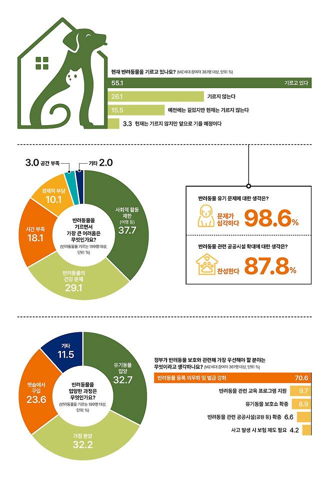 반려동물은 이제 가족의 일원으로 자리 잡은 것으로 보여요. 이런 트렌드를 반영해 반려견 전용 항공기, 반려인을 위한 맞춤형 템플스테이 같은 서비스가 속속 등장하고 있죠. 하지만 이런 변화를 과도하다고 여기는 경우도 있어요. 특히 공공장소에서 반려동물로 인한 소음이나 위생 문제 등으로 갈등이 일어나기도 해요. MZ 맞춤형 경제 콘텐츠 뉴스레터 '어피티'가 머니레터 구독자 361명 대상으로 MZ세대는 반려동물과 관련된 문제들을 어떻게 바라보고 있는지 물어봤어요. 가장 좋아하는 반려동물, 반려동물을 키우는 이유, 반려동물 보호와 관련해 가장 우선해야 할 정책 등 MZ세대의 반려동물 문화에 대한 생각을 정책주간지 'K-공감'에서 확인하세요.