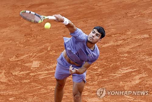 epa12020351 Carlos Alcaraz of Spain in action during his second round match against Francisco Cerundolo of Argentina at the ATP Monte Carlo Masters tennis tournament in Roquebrune Cap Martin, France, 09 April 2025. EPA/SEBASTIEN NOGIER