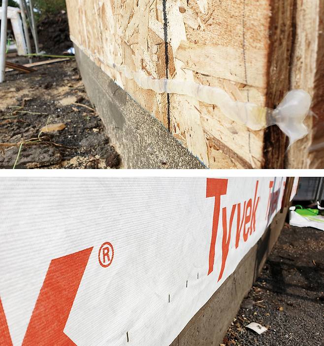 짚보드를 권장하지만, 차선책으로 타이벡에 대해서도 말해보겠다. 타이벡의 역할은 외부 물기를 차단하면서 실내 내부 습기 방출하고 기밀성을 확보하는 데 있다. 현재 다양한 제품이 수입되고 있는데 크게 타이벡에 주름이 있는 제품과 1~2㎜ 크기 플라스틱 돌기(엠보싱)가 있는 제품 그리고 일반적인 제품으로 구분할 수 있다.