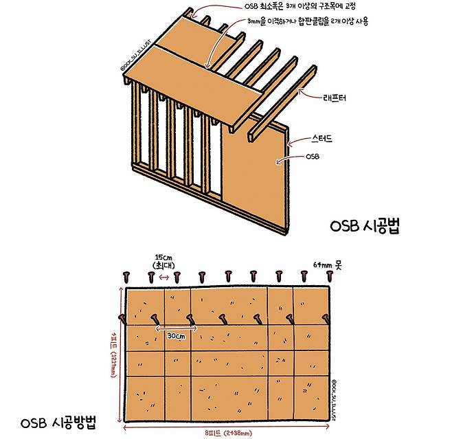 OSB는 벽체와 지붕에 시공하게 되는데 64㎜ 못(네일)으로 테두리는 6인치(15㎝), 중심부는 12인치(30㎝) 간격 이내로 박는다. OSB 사이에는 합판 클립을 넣거나 아니면 1/8인치(3㎜) 간격을 두어 습기로 인해 합판 부피가 늘어나는 현상을 대비해 유격을 주게 된다. 여기서 못 박는 간격은 최대치이며 쉽게 말하면 조금 더 촘촘히 박아도 상관없다. 캐나다 현장 견학 때 2~3㎝ 간격으로 시공된 OSB를 본 적도 있다.그리고 그림처럼 OSB를 지붕에서 연속으로 시공할 때는 밑에 시공한 합판과 끝나는 지점을 달리 해야 하고 OSB의 최소 사이즈는 벽이라면 스터드 3개 이상과 결속되어야 하고 지붕인 경우도 레프터 3개 이상에 걸쳐 시공되어야 한다.