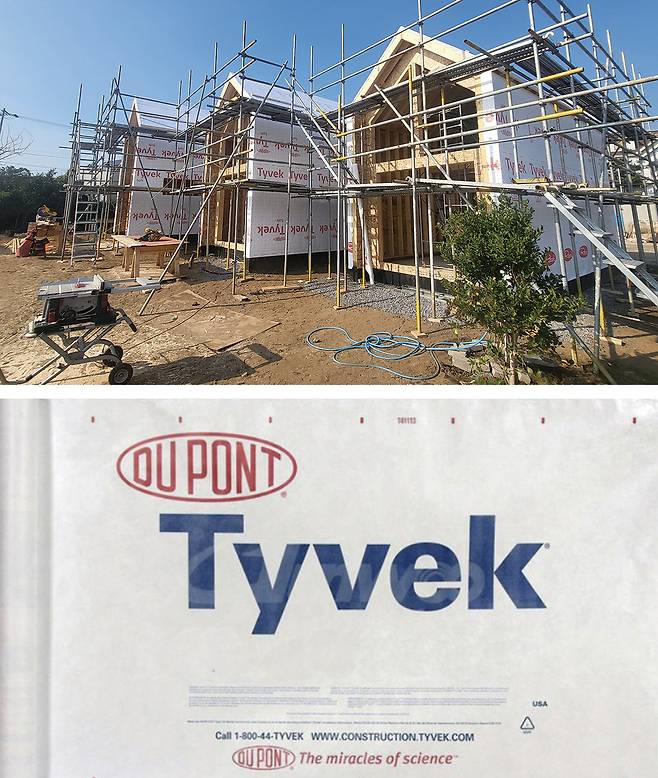 짚보드를 권장하지만, 차선책으로 타이벡에 대해서도 말해보겠다. 타이벡의 역할은 외부 물기를 차단하면서 실내 내부 습기 방출하고 기밀성을 확보하는 데 있다. 현재 다양한 제품이 수입되고 있는데 크게 타이벡에 주름이 있는 제품과 1~2㎜ 크기 플라스틱 돌기(엠보싱)가 있는 제품 그리고 일반적인 제품으로 구분할 수 있다.