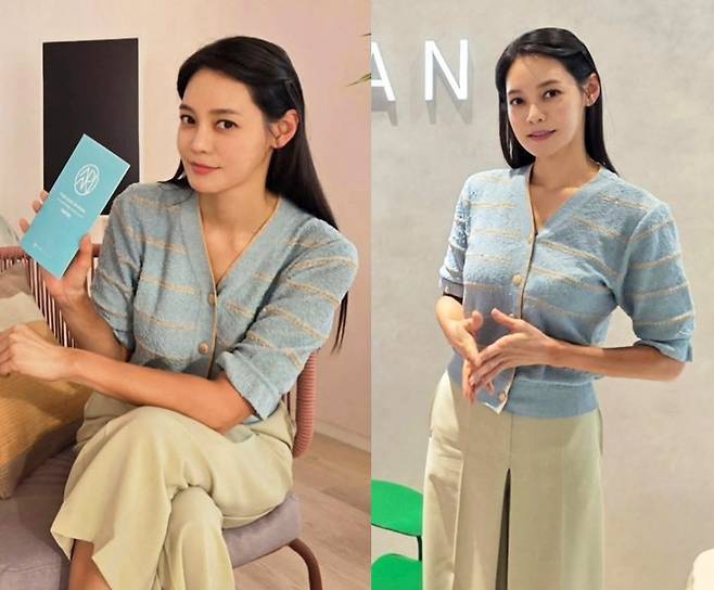 민트빛 스트라이프 니트와 베이지 컬러 와이드 팬츠를 매치한 단정한 스타일링으로 단아한 분위기를 자아냈습니다.