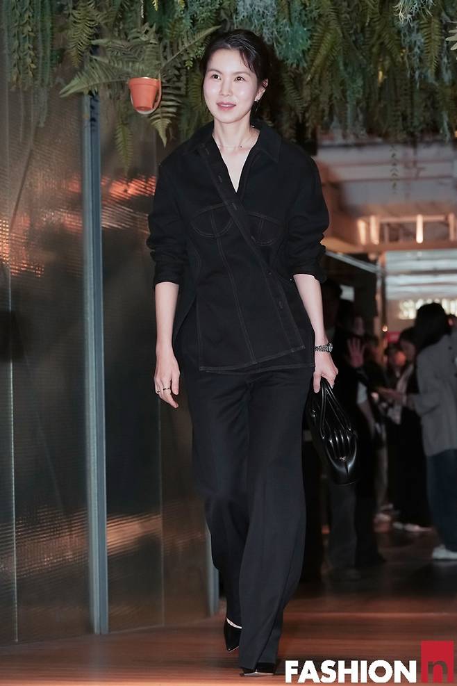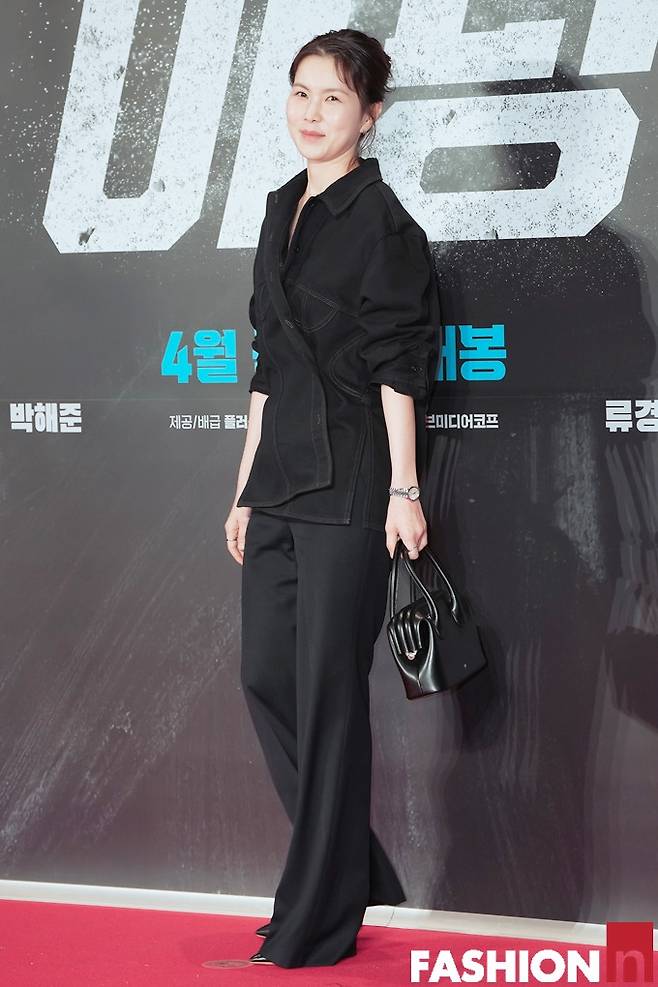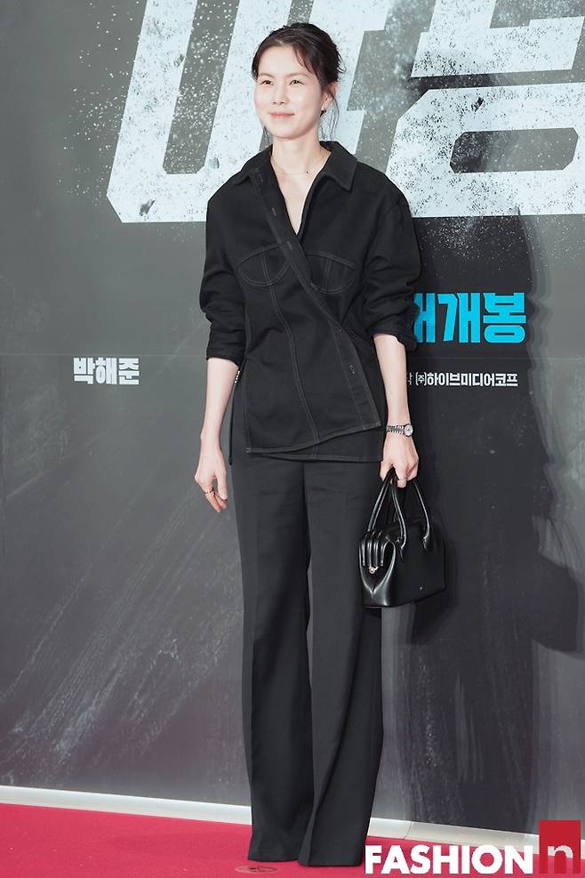 이날 공민정은 옆트임이 있는 드레이프 셔켓에 블랙 팬츠를 매치한 올 블랙 시사회룩으로 멋스러우면서도 스타일리시한 봄 패션을 선보였다.