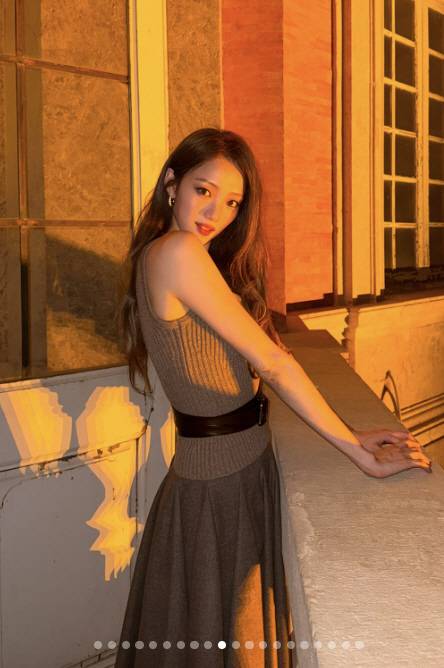 니트 재질의 몸에 딱 붙는 민소매 나시와 같은 톤의 롱 스커트로 우아함과 섹시함을 모두 챙겼다.