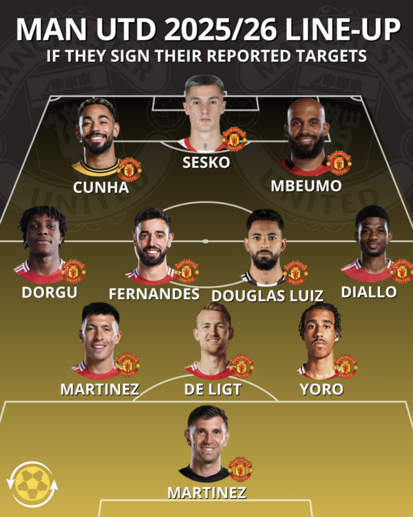 유럽 축구 이적시장 소식을 전문적으로 다루는 '트랜스퍼 뉴스 라이브'는 28일(이하 한국시간) 2025-26시즌 맨유의 예상 라인업을 공개했다.
