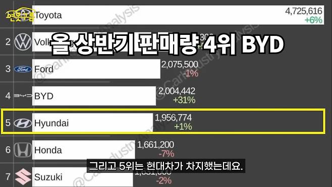 Car Industry Analysis 조사 결과에 따르면, 올해 상반기 글로벌 자동차 판매 실적에서 토요타가 1위를 차지했으며, 폭스바겐 2위, 포드 3위에 이어 중국 브랜드 BYD가 4위에 진입한 것으로 나타났다. 현대차는 5위를 기록했으나, BYD가 현대차를 앞선 것은 처음으로 중국차의 성장세가 두드러지고 있다. 기아는 9위를 차지했으며, 현대차그룹 전체로는 현대차와 기아, 제네시스를 합쳐 약 350만 대 이상의 판매량으로 TOP3 수준을 유지하고 있다.